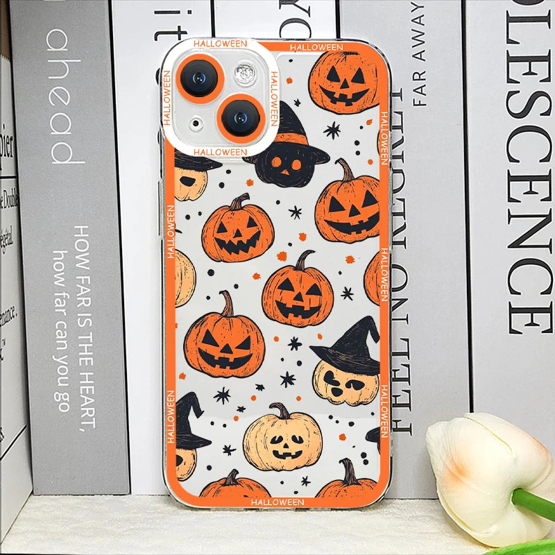 Protege tu móvil con el auténtico espíritu de Halloween gracias a esta funda repleta de calabazas sonrientes y embrujadas. Su diseño naranja y negro, con detalles de brujitas y sombreros mágicos, es ideal para quienes quieren un look terrorífico pero divertido.