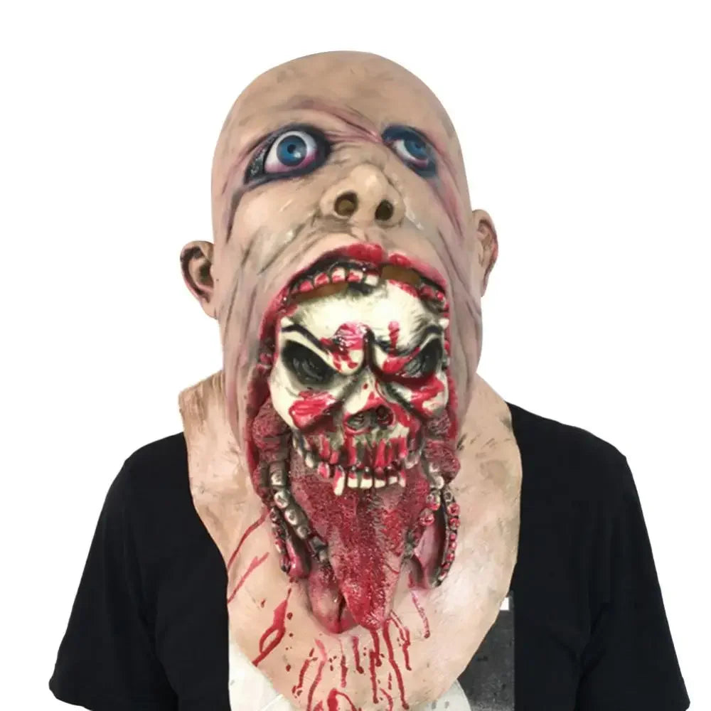 Dale un toque espeluznante y perturbador a tu disfraz con la Máscara Doble Horror Calavera Sangrienta. Su diseño único representa a un rostro humano del que emerge una calavera ensangrentada desde la boca, creando un efecto visual macabro y realista que dejará a todos sin palabras.